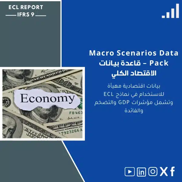 مجموعة بيانات الاقتصاد الكلي المهيأة مباشرة للاستخدام في نماذج احتساب الخسائر الائتمانية المتوقعة (ECL) طبقاً لـ IFRS 9. تحوي سلاسل GDP، التضخم (CPI)، وأسعار الفائدة، بمستويات تاريخية وسيناريوهات مستقبلية جاهزة للتطبيق والتحليل ضمن سيناريوهات الائتمان والافصاحات المالية.