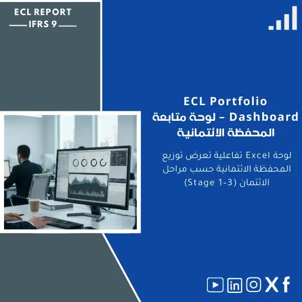 - الأقسام المضمَّنة: إدخال البيانات، قواعد التصنيف المرحلي، حسابات 12‑month وLifetime ECL، ورقة الافتراضات، جداول الإفصاح، مصفوفات التقرير والمخططات.